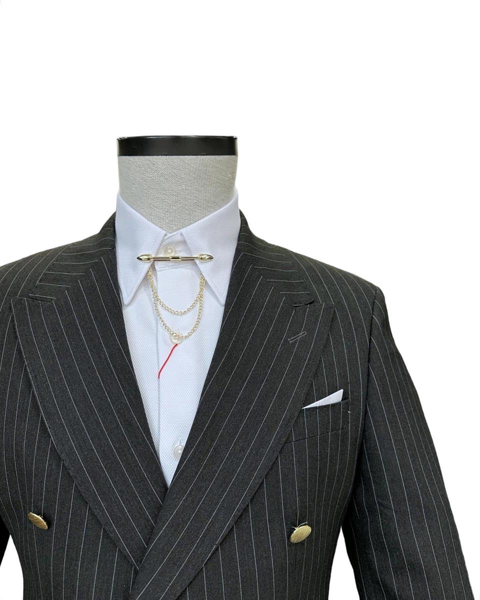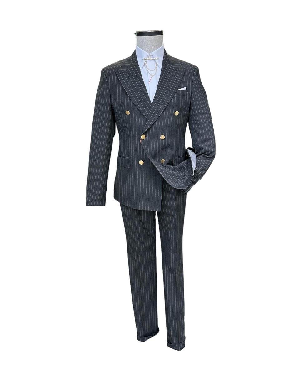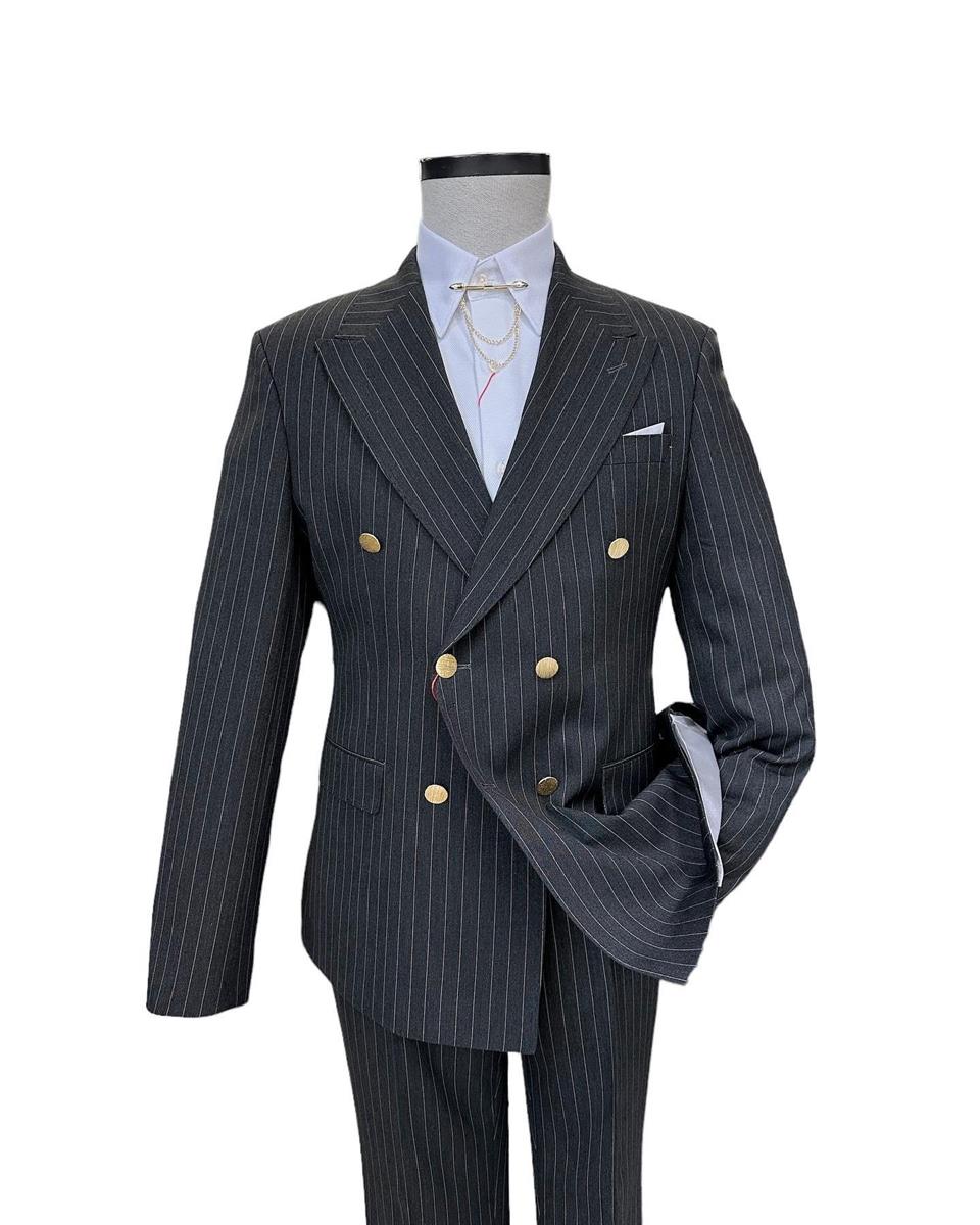 The slim-fit double-breasted suit available at 4akc.com offers both style and elegance. Featuring a clean line and gold-colored buttons, this suit allows you to create a striking outfit. The wide double-breasted collar and double vent details provide a modern and chic look. By choosing this suit, you can confidently express yourself at any special event or business meeting. Reflect your style and feel special with this item from 4akc.com.