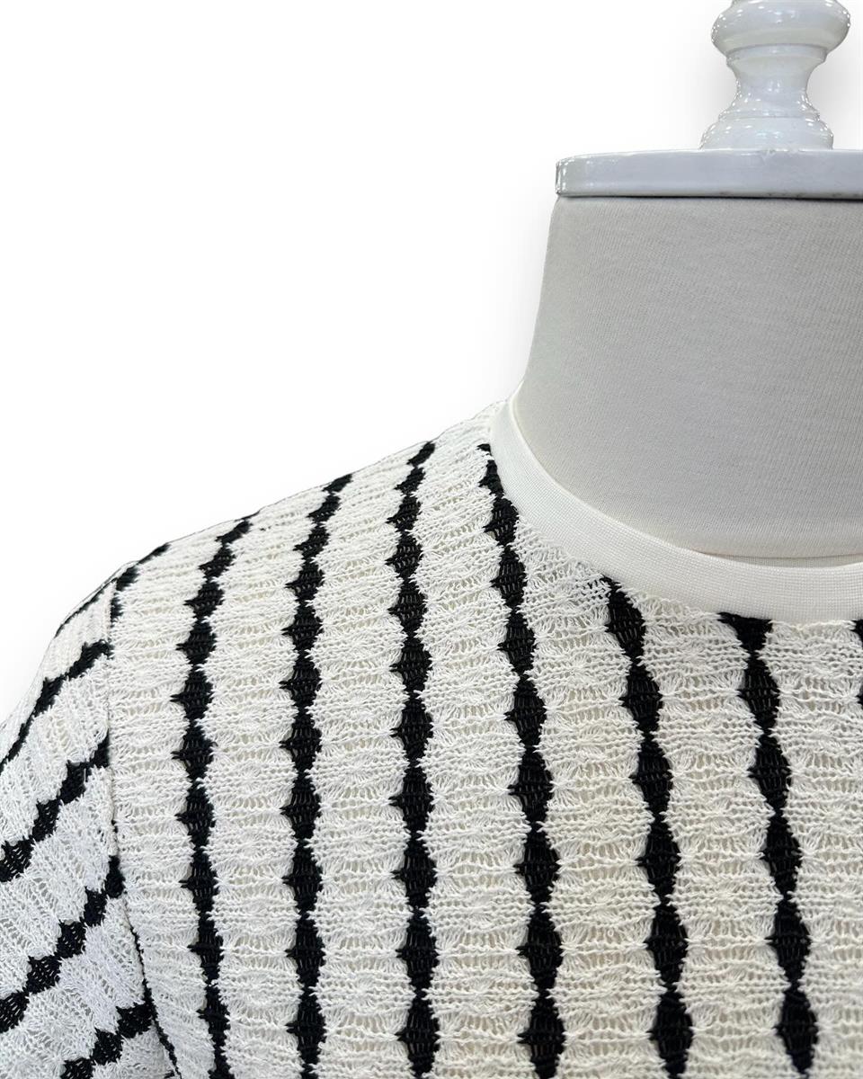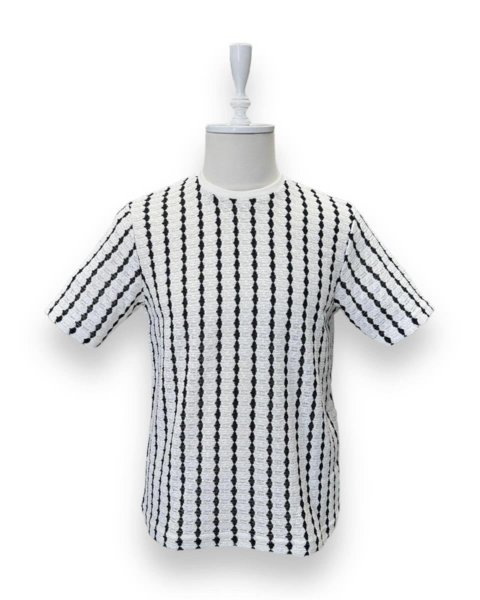 Mesh-textured, collarless t-shirt.