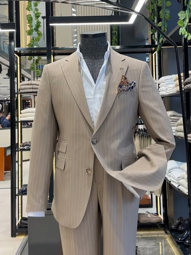 Slim Fit İnce Çizgili Bej Frame Takım Elbise