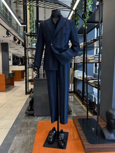 Standart Fit Gölge Çizgili Lacivert Kruvaze İmperial Takım Elbise